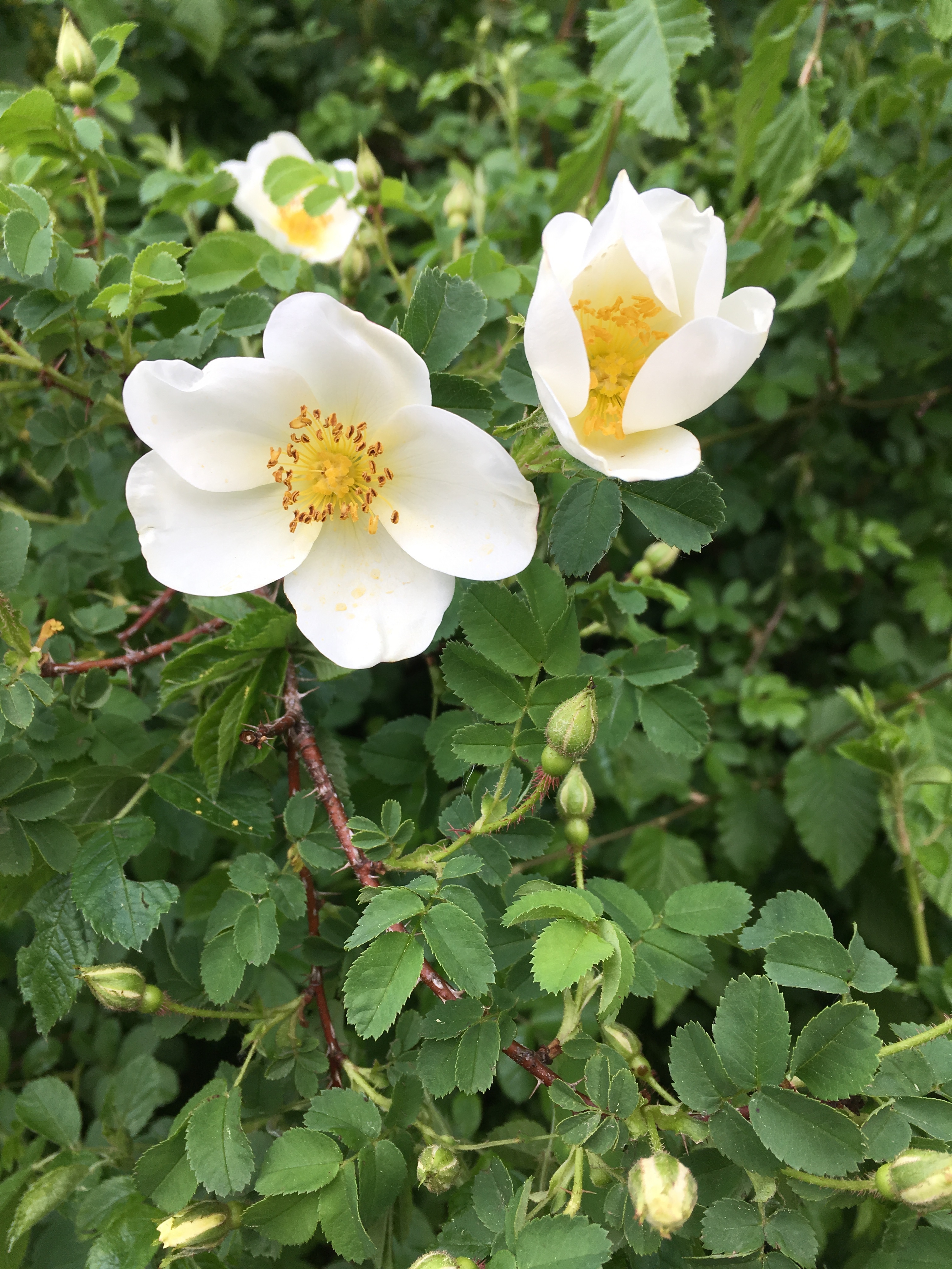 Beschreibung: Die Heckenrose ist wie alle anderen Rosengewächse für Kaninchen fressbar. Sie ist eine strauchig wachsende Pflanze. Ihre Blätter sind wechselständig, unpaarig gefiedert. Die Blätter selbst sind rundlich bis elliptisch mit gesägten Blatträndern. Die Zweige der Heckenrose besitzen kräftige, hakig geformte Dornen. Zur Blütezeit im Frühsommer trägt sie fünf-blättrige weiße bis zartrosane Blütenblätter. Die gelben Griffel sind deutlich erkennbar. Als Früchte entwickelt sie orange-rote Hagebutten. | ||||