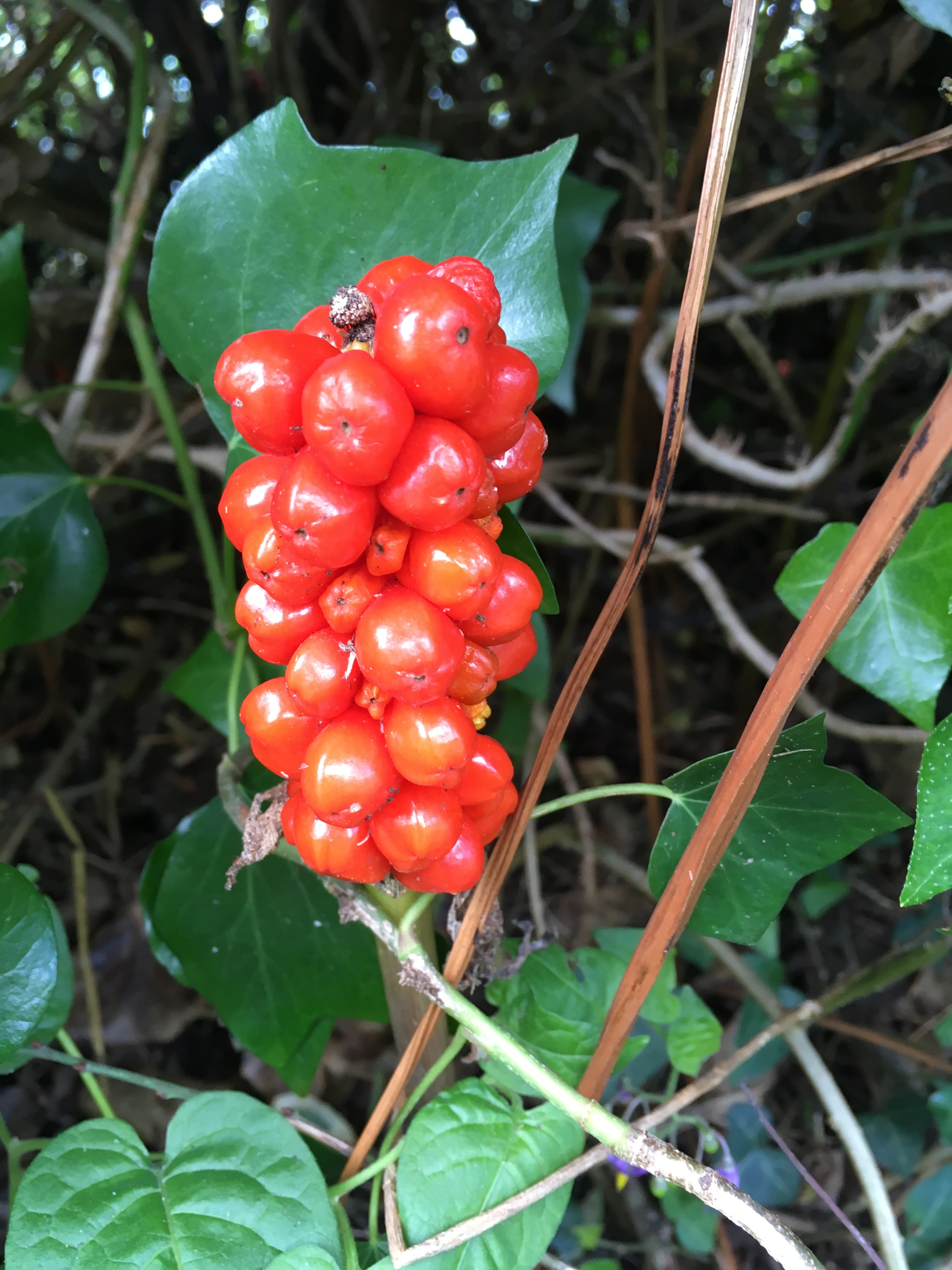 Beschreibung: Aronstab ist stark giftig! Er wächst vor allem auf Waldböden. Seine Blättern ähneln manchen Ampfersorten. Sie sind recht robust und oft fett-glänzend. Manche haben eine weiße Musterung. Am hinteren Ende läuft das Blatt zu zwei Spitzen zu, was ihm die typische Form einer Pfeilspitze verleiht. Auch die Blüte hat die Form einer Stabspitze. Am Fruchtstand des Aronstabs befinden sich unreife grüne oder reife rote Beeren. | ||||||