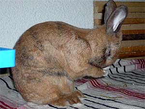 Cara ist ungefähr Anfang 2007 geboren und kam mit ihren Babys in unsere Obhut. Die kleine Häin ist sehr zart und wiegt 1,4 kg. Cara ist ein absolutes Traumkanichen, stubenrein, sehr verschmust und hört auf ihren Namen. Nachdem ihre Viererbande so langsam flügge wurde, war auch für Cara die Zeit gekommen, sich nach einem neuen Zuhause umzusehen. Dieses ließ auch nicht lange auf sich warten und Cara konnte in ein liebevolles Zuhause vermittelt werden. Rammlerchen Flocke wurde von der selbstbewussten Kaninchendame zur Begrüßung ordentlich durchgerammelt, danach wurde gekuschelt. Einzig die Mietzekatzen im neuen Zuhause haben Cara anfangs irritiert, kannte sie doch solche Stubentiger noch nicht. Aber nach wenigen Tagen hat sich Cara nun auch an diese Mitbewohner gewöhnt und hat das Herz ihrer neuen Möhrchenspenderin im Sturm erobert.