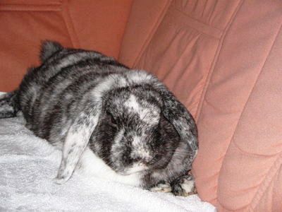 Frodo ist ein Traumkaninchen. Er ist 100% stubenrein, frisst viel Heu, lässt sich sehr gerne streicheln und schmeisst sich auch auf die Seite um zu schlafen. Da stört es ihn auch nicht, wenn Menschen neben ihm laufen. Da er in seiner vorigen Gruppe stets ein Außenseiter blieb, musste sich seine Möhrchenspenderin schweren Herzens von ihm trennen. Im neuen Zuhause hat Frodo aber eine Herzensdame ganz für sich alleine und weit und breit keine anderen Langohren, die ihm seine Schlappohrfrau abspenstig machen können. Nach wenigen Tagen wird hier schon gekuschelt und Frodo scheint happy zu sein, nun auch eine Partnerin zu haben.