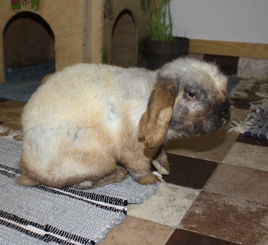 Fabius ist der letzte Überlebende einer ehemaligen Hobbyschlachtung und war scheinbar zu alt, um noch gegessen zu werden. Er kam zu uns mit beidseitiger Ohrräude/Otitis, viel zu langen bogenförmigen Krallen und eingeschränkter Beweglichkeit. Seine Vorderpfoten sind x-förmig nach außen gespreizt und er hat viel zu wenig Muskelmasse an den Hinterläufen, wodurch er mitunter sehr wackelig auf den Pfoten steht. Dafür hat er größere Fettpolster im vorderen Rumpfbereich, alles Indizien dafür, dass er in seinem bisherigen Leben massiv an Bewegungsmangel gelitten haben musste. In der Pflegestelle taut er nun langsam auf und macht mittlerweile auch gerne ein paar Hoppler, wird aber noch schnell müde dabei. Trotzdem ist er sehr neugierig und untersucht gerne seine Umgebung. Er wird nun gegen den Eiter in seinen Ohren behandelt, um wieder gesund zu werden, damit er möglichst bald kastriert werden kann. Wenn das geschehen ist muss er noch seine Kastrationsquarantäne absitzen. Und mit etwas Glück kann er dann endlich ein artgerechtes Kaninchenleben zusammen mit einer Partnerin oder in einer Gruppe führen.