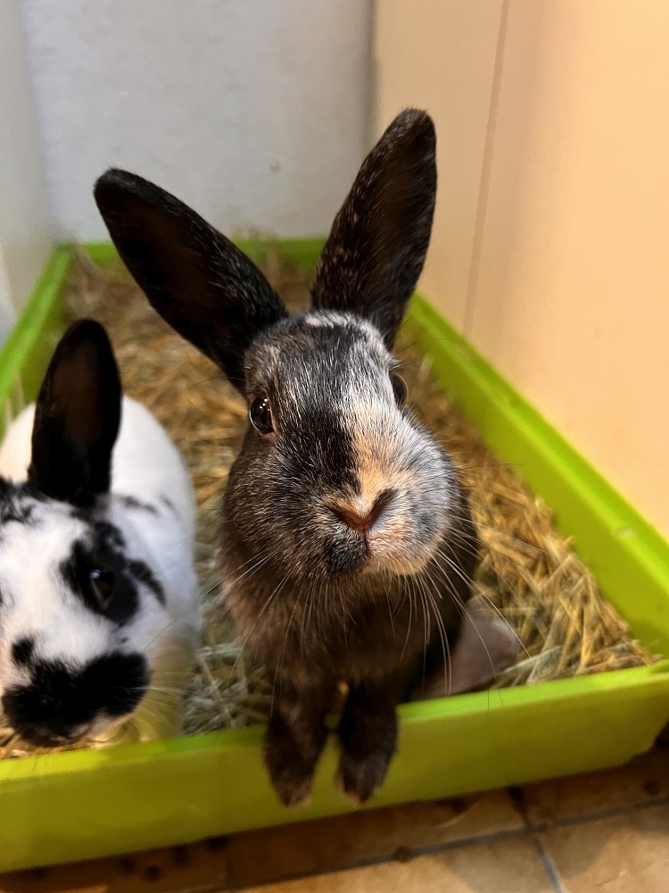 Finja kam am 06.09.2021 zusammen mit 5 weiteren Geschwistern in einer unserer Pflegestellen auf die Welt. Obwohl Mama Ella sehr abgemagert war hat sie sich ganz toll um die kleinen gekümmert. Die Kleinen sind noch nicht so recht stubenrein, liegt aber sicher auch daran das sie mitten in der Pubertät sind. An guten Tagen können sie auch einigermaßen ordentlich sein. Finja ist sehr neugierig und frech. Gegenüber ihren Geschwistern ist sie eher dominant. Sie hat viel Unsinn im Kopf und bringt einem immer wieder zum schmunzeln. Finja wiegt etwa 1,6-1,7Kg. Sie wurden alle mit Filavac (RHD1 und 2) und Nobivac Plus geimpft. Die Kleinen suchen einen Endplatz mit netter Kaninchengesellschaft. Gerne vermitteln wir auch ein Geschwisterpaar. Die Männchen sind natürlich kastriert. Sie sind Frischfutter inkl. Wiese und Kohl gewöhnt und vertragen bisher alles problemlos.